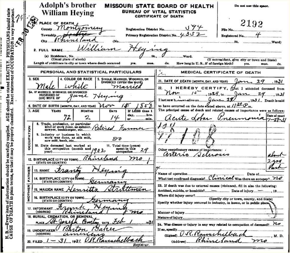 Adolph's Brother William Death Certificate, a farmer also buried at St. Joseph's in Rhineland. (PDF) |
