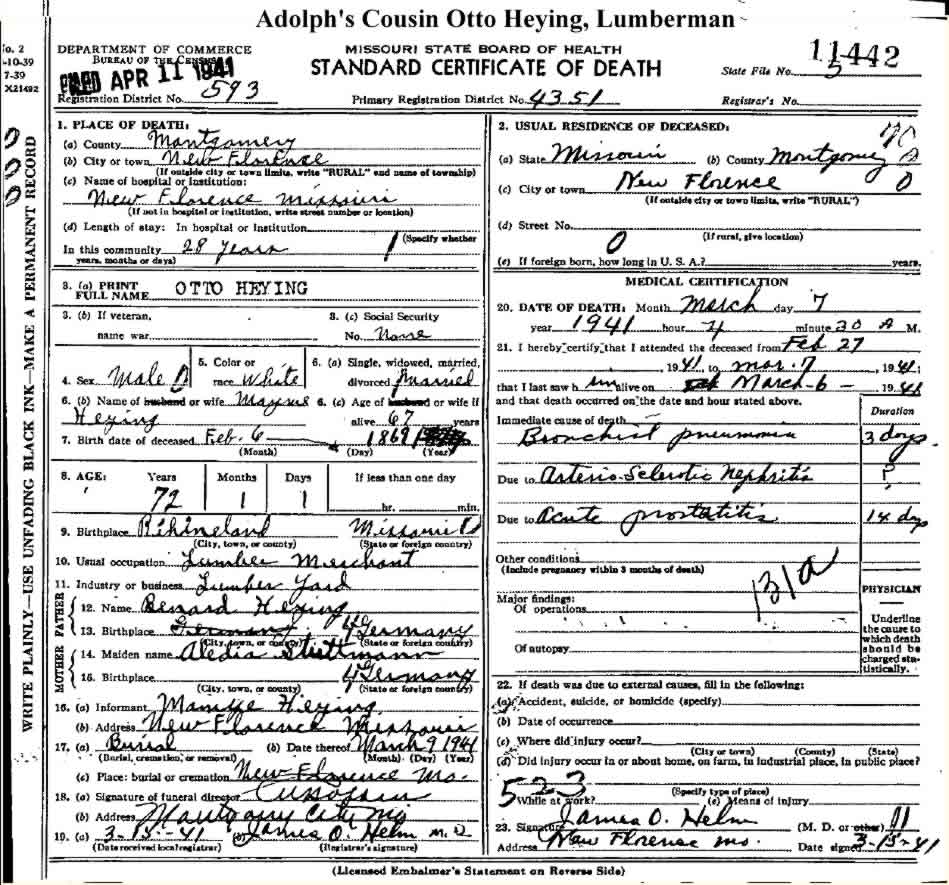 Adolph's Cousin Otto Death Certificate. He was a lumberman just north of Rhineland in New Florence, Missouri. (PDF) |