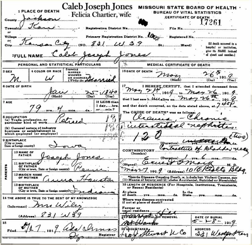 My Great Great Grandfather Caleb Jones' Death Certificate